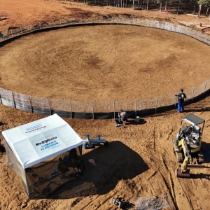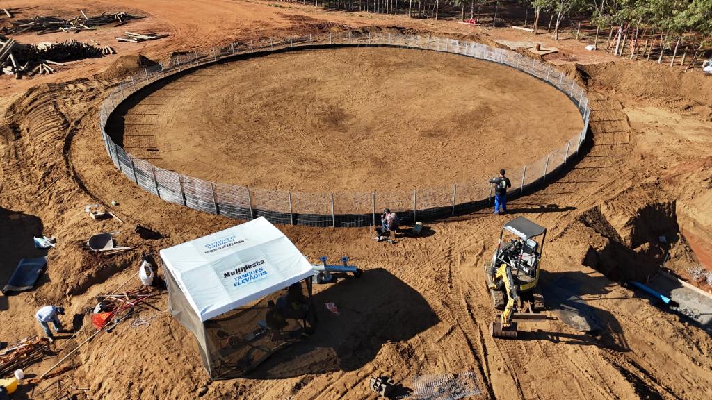Nesta obra, a Multipesca executou a instalação de um tanque elevado com 25 metros de diâmetro, projetado para funcionar como reservatório de 800 mil litros de água destinado ao abastecimento de um sistema de confinamento de gado.