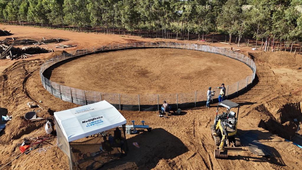Nesta obra, a Multipesca executou a instalação de um tanque elevado com 25 metros de diâmetro, projetado para funcionar como reservatório de 800 mil litros de água destinado ao abastecimento de um sistema de confinamento de gado.